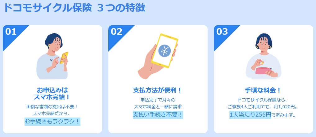 この保険のメリットは、まずはドコモ公式HPから申込可能で保険料が携帯電話料金と合算される点が挙げられます。既にドコモユーザーでdアカウントがあれば、個人情報の入力を省略して申込みが可能です。保険料も携帯電話の料金と合算されて請求されるため、新たにクレジットカード情報を入力する必要もありません。
