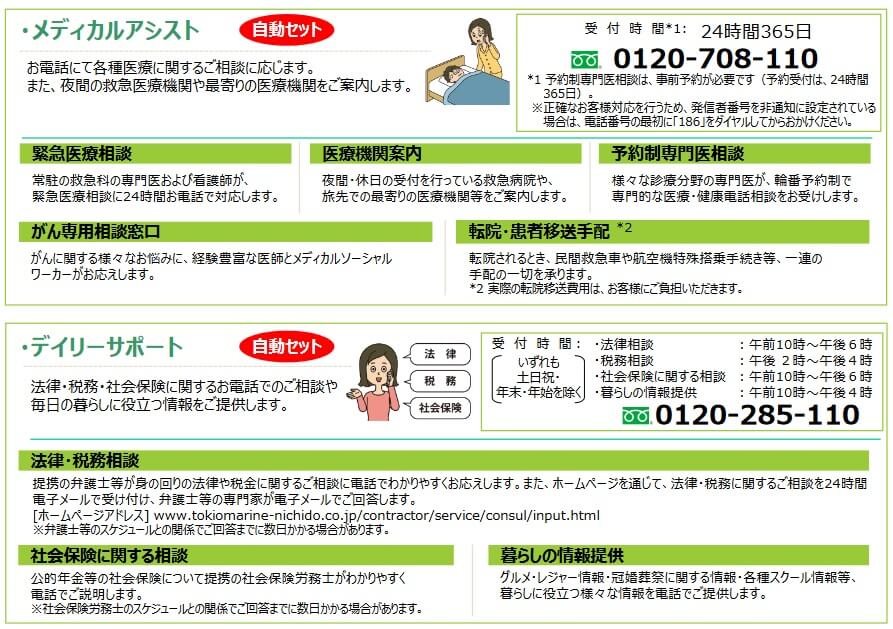 その他に東京海上のデイリーサポート・メディカルアシストという無料サービスが使えます。前者は法律・税務・社会保険の相談に加えて、グルメ・レジャーに関する相談ができます。後者はケガ・病気に関する相談の他、夜間の救急医療機関等の案内もしてくれます。