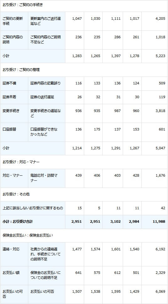 また、この保険の引受保険会社である東京海上ですが、同社に寄せられた苦情数は35845件(2024年度累計)でした。苦情の中身は「保険金支払」が最多で、担当者からの連絡遅れ・手続きの説明不足・保険金支払の可否についての苦情が多かったようです。次いで「契約の手続き・管理」の苦情が多く、更新案内の送付遅れ・契約内容の変更手続きの苦情が多かったようです。意外と担当者の応対・訪問マナーへの苦情も多めでした。