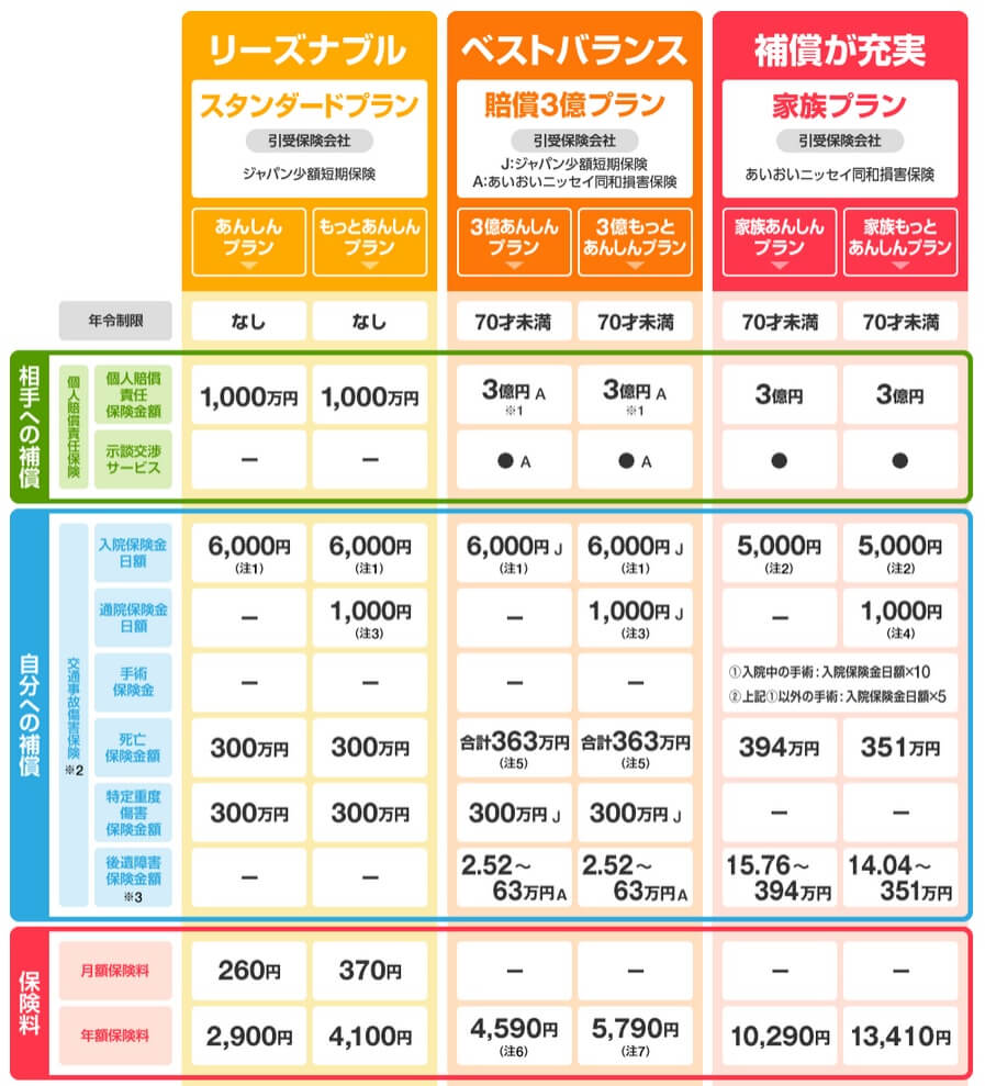 補償・サービス面でいえば、示談代行サービスがあるのもメリットです。示談交渉サービスがあるのは賠償3億プランと家族プランのみですが、示談するのはジャパン少短ではなく引受保険会社のあいおいニッセイ同和損保が行います。他社には示談代行が無い保険(もしくは示談交渉に不安がある保険)がありますが、この保険なら大手の保険会社が示談交渉してくれるので安心感があります。