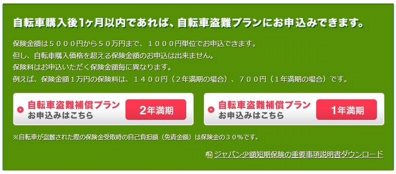 その他にケガ・個人賠償の補償に加えて、各プランには自転車盗難の補償が付けられます。自転車を購入してから1ヶ月以内の場合のみ加入でき、自転車を盗難されると保険金(5000円~50万円)が受け取れます。