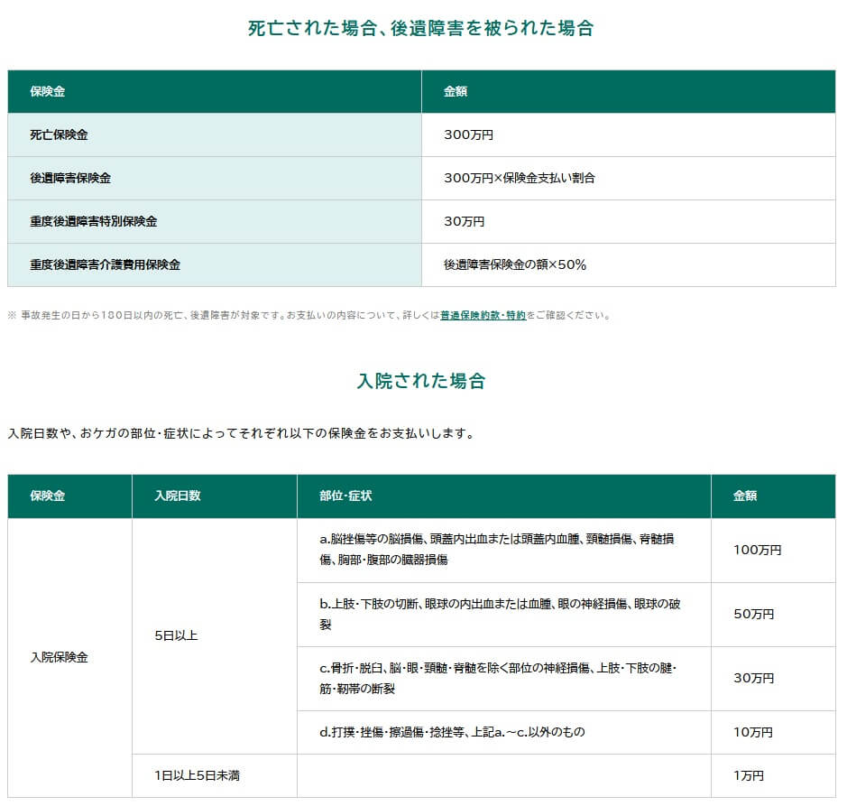 ちなみに本家の自転車保険なら、自転車に乗っている時のケガなら入院しても通院しても保険金が受け取れ、加害者となった場合の個人賠償責任補償も付いています。それでも保険料は月額300~500円(年間4000~6000円程度)のため、この保険の保険料が安いとはいえ、自転車保険の方が保険料は節約できます。
