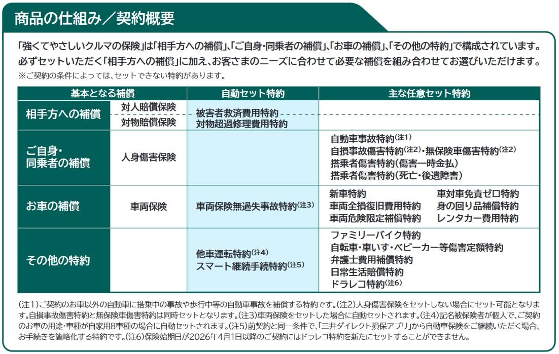 また、同じMS&ADグループの三井住友海上の自動車保険でも、同様に自転車事故向けの特約が揃っています。それでは以下で補償内容・保険料・メリット・デメリット・評判等を解説し、他社の自動車保険の自転車向け特約と比較していきます。