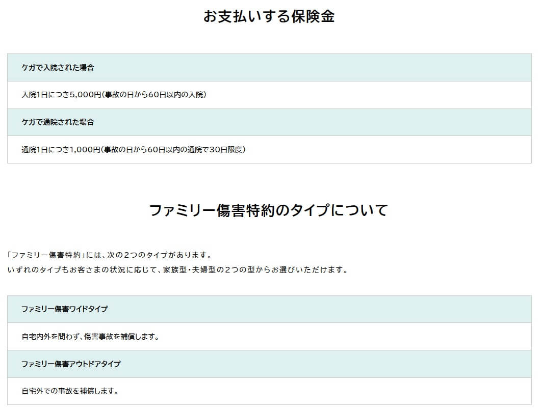 この特約が登場したのが2024年9月1日以降で、それ以前にあったのがファミリー傷害特約でした。ファミリー傷害特約なら自動車以外との事故(自転車と自転車の事故など)でケガをすれば、入院1日につき5000円が受け取れ通院1日でも1000円が受け取れました。それもワイドタイプにすれば自宅内でケガして入院・通院しても保険金が受け取れました。この特約は残念ながら2024年8月末で販売を終了してしまいました。