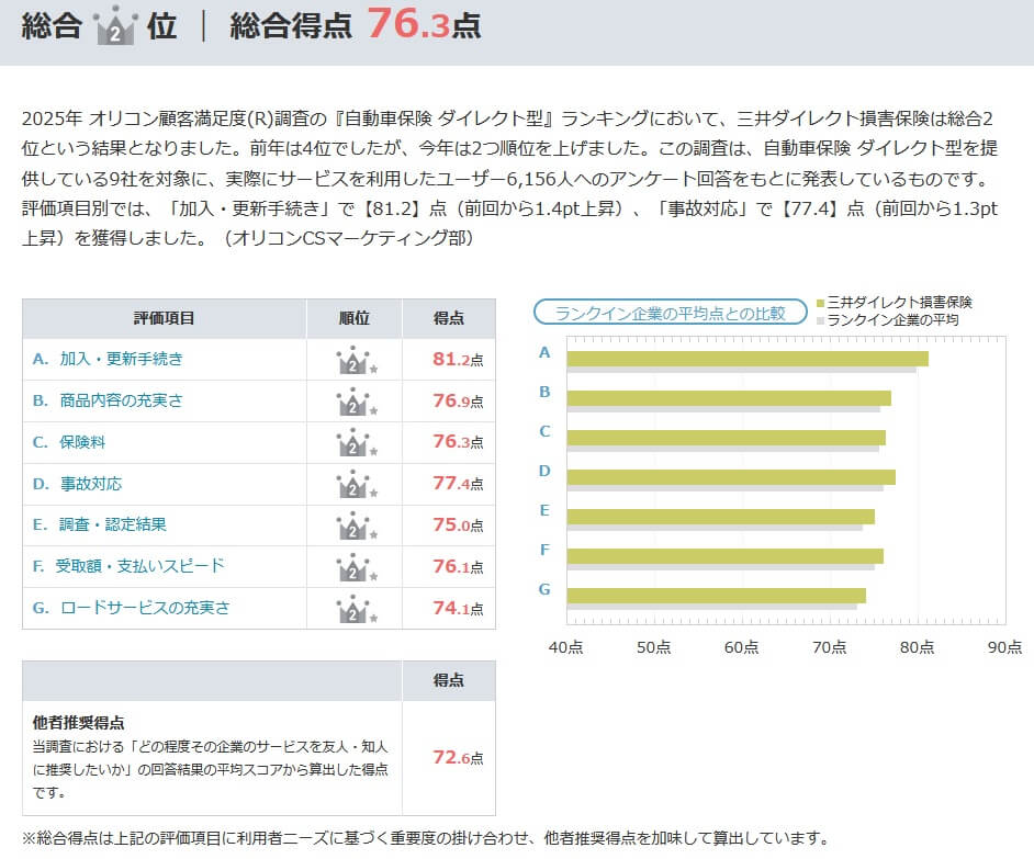また、オリコンの自動車保険 顧客満足度ランキング2025(ダイレクト型)でも、三井ダイレクト損保は9社中で2位でした。1位こそソニー損保に譲っていますが、トップ3に入っているため顧客の満足度は高いです。前年度の4位から順位を上げており、年々改善しているのも評価できます。