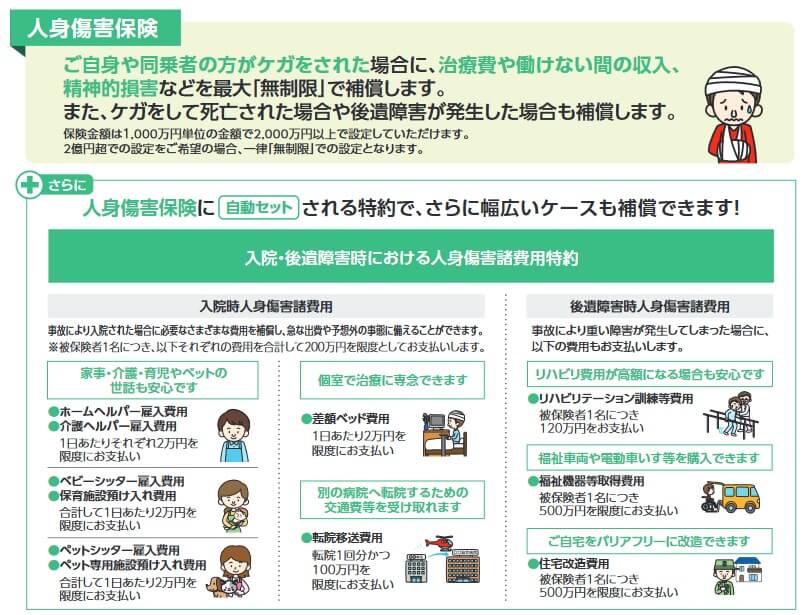 さらに人身傷害保険に自動セットされている入院・後遺障害時における人身傷害諸費用特約もメリットでしょう。通常はケガの治療費の他に休業中の損害・遺失利益等が補償されますが、それらに加えて入院時の諸費用も保険金として受け取れます。ホームヘルパー・ベビーシッター・ペットシッターの雇入費用として各2万円、差額ベッド代で1日あたり2万円等が受け取れます。