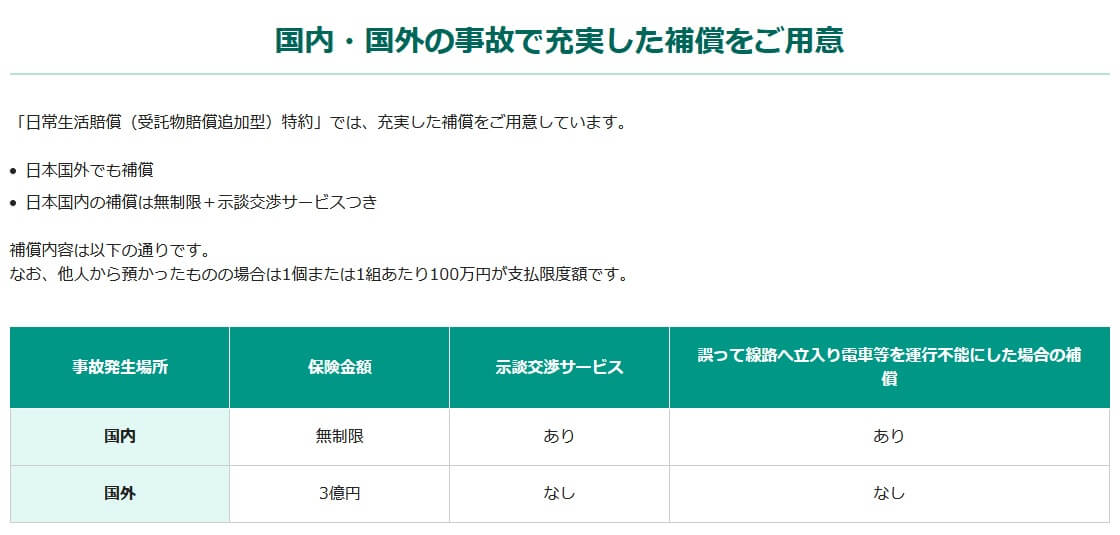 また、日常生活賠償特約の補償額が無制限で、かつ国外でも3億円まで補償されるのも見逃せません。他社では上限額を1~3億円にしている保険が多い中で、この保険は無制限で補償されるため安心感が段違いです。国外でも3億円まで補償されるため、海外旅行中に子供がホテルの備品・装飾品を壊した等でも利用できます。