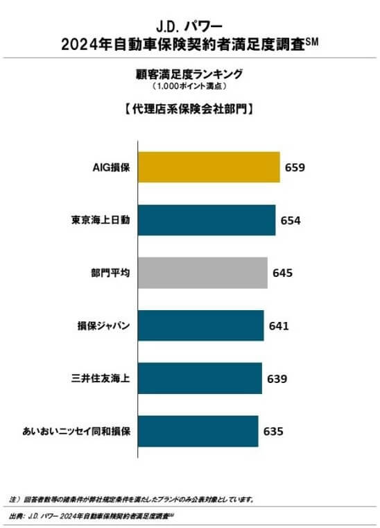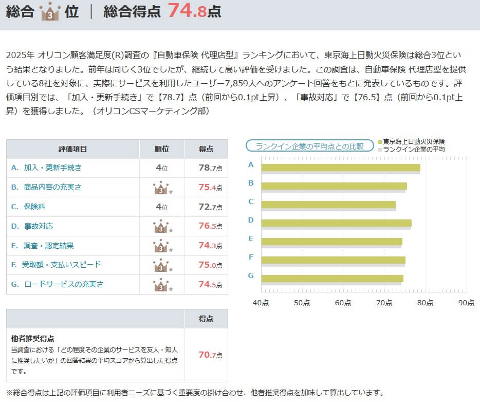 また、調査会社のJDパワーの自動車保険契約者満足度調査2024(代理店部門)では、東京海上は5社中で2位とトップ3に入っていました。この調査は契約手続き・保険料・事故対応・顧客対応等が調査項目ですが、保険証券の部門ではAIG損保を抜いて最高評価を得ていました。自動車事故対応満足度調査でも12社中で6位のため、全体の満足度ほどではないものの一定の満足度はあるようです。