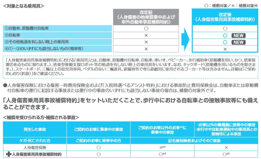 2024年1月から付けられる人身傷害乗用具事故補償特約は、自動車以外の乗り物に乗っている最中にケガしたり、歩行中に自動車以外の乗り物と接触した時に人身傷害保険が適用される特約です。乗り物には自転車の他に、原付・車イス・歩行補助車が含まれます。つまり、この特約を付ければ自転車に乗っている最中にケガしても、歩行中に自転車と接触してケガしても補償されます。