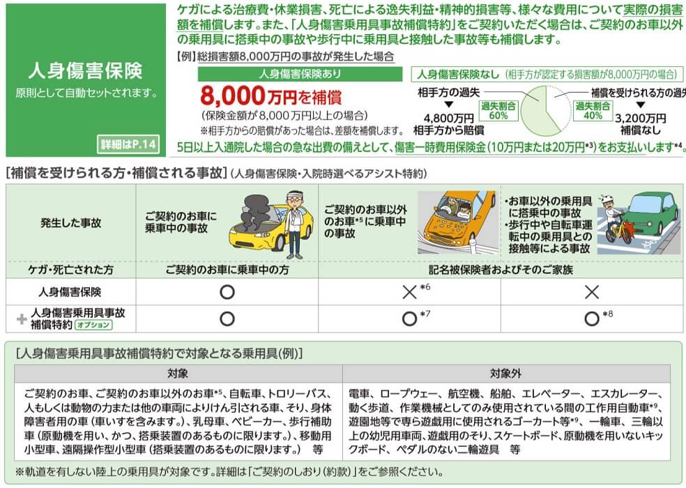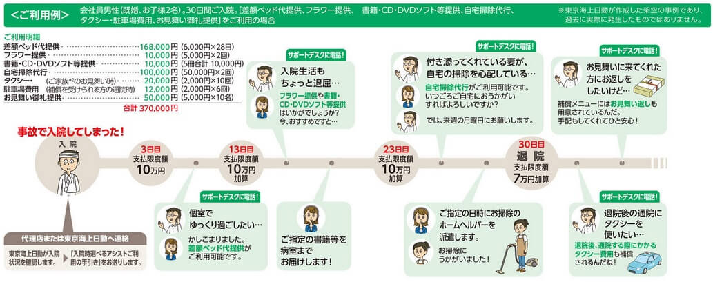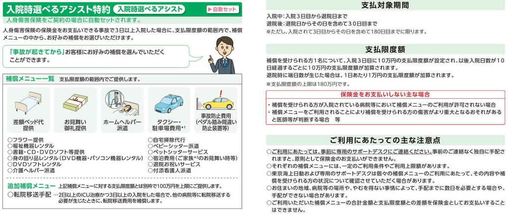 人身傷害保険には入院時選べるアシスト特約が自動セットされています。人身傷害保険が適用されるケガで3日以上の入院となると、10万円を限度に様々なメニューから補償を選べます。その中には差額ベッド代の他に、書籍などのコンテンツ利用料やホームヘルパー派遣料・退院お祝いサービスなど多岐に渡ります。