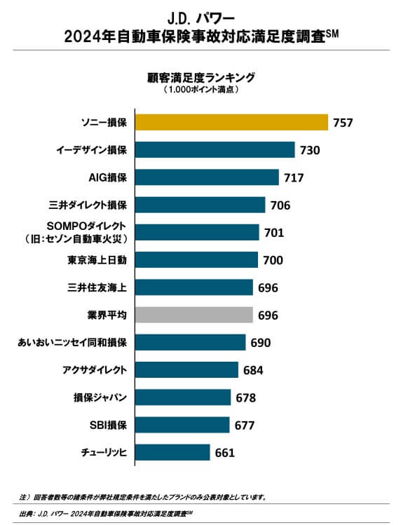 さらに調査会社のJDパワーの自動車保険契約者満足度調査2024(ダイレクト系)によると、チューリッヒは7社中で2位と満足度は高いです。この調査は契約手続き・保険料・事故対応・顧客対応等が調査項目ですが、保険料の価格についてはソニー損保を抑えて最高評価を受けていました。しかし、事故対応の満足度では最下位に沈んでいるため事故対応には不安が残ります。