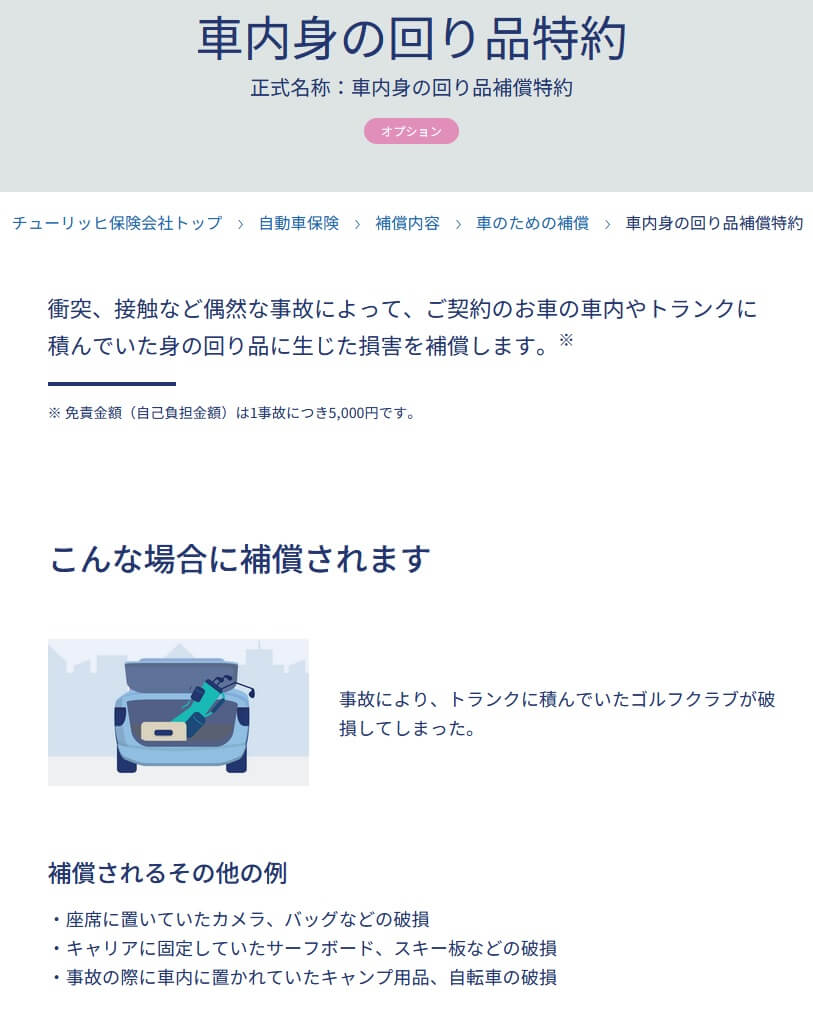 また、車内身の回り品特約は自転車の破損も補償される点も見逃せません。この特約は車内やトランクに置いていた身の回り品やキャリアに固定されていたスポーツ用品が破損した時に補償されます。他社では自転車は対象外としている保険が多い中で、チューリッヒでは公式HPによると自転車も対象となっています。