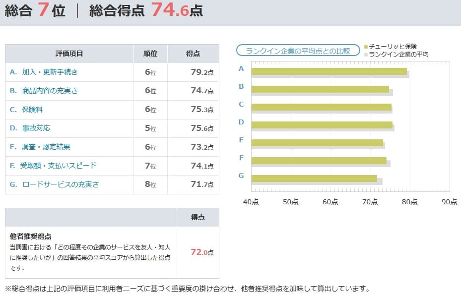 さらにオリコンの自動車保険 顧客満足度ランキング2025(ダイレクト型)でも、チューリッヒは9社中で7位と下位でした。この調査では加入更新手続き・商品内容・保険料・事故対応等の評価項目毎の順位もありますが、JDパワーと異なり保険料も6位と低い満足度でした。他の項目も概ね6~8位が多く満足度が高いとはいえません。