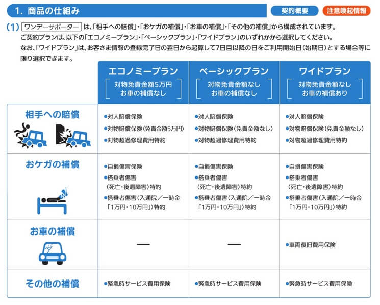 この保険にはエコノミープラン・ベーシックプラン・ワイドプランの3つがあります。販売開始当初はエコノミープランはありませんでしたが、現在はベーシックプランより保険料が安く補償内容が少し劣ったエコノミープランがあります。そのエコノミープランは自動車事故で他人を傷つけた場合の対人賠償、他人の物を壊した場合の対物賠償が無制限で補償されます。ただ、対物賠償には5万円の自己負担額(免責金額)があります。