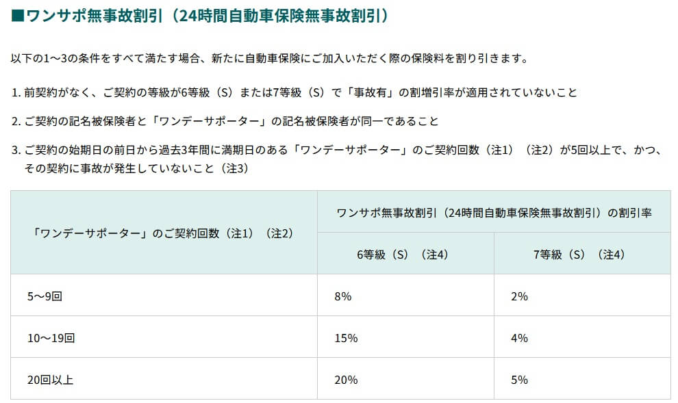 さらにワンデーサポーターではなく1年単位の通常の自動車保険に加入する場合、ワンデーサポーターの利用回数と無事故での利用回数に応じて、通常の自動車保険の保険料が割引されます。20回以上の利用で無事故となれば、保険料は20%も割引されます。