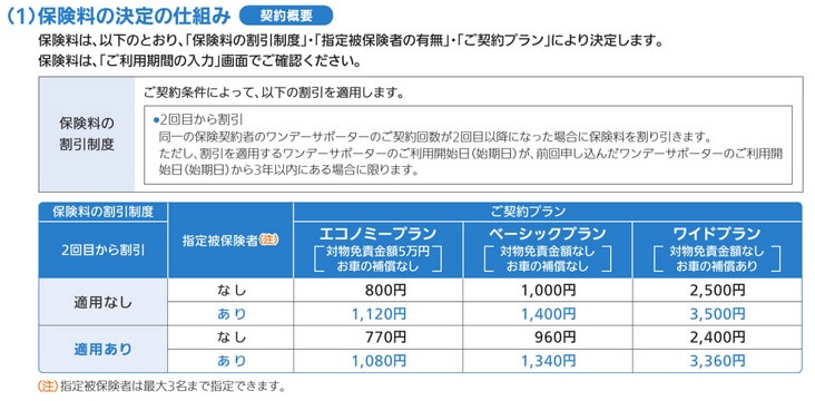 この保険の保険料は選択したプラン・利用回数(2回目以降か)・指定被保険者の有無によって異なります。保険料が最も安いエコノミープランの保険料は24時間で800円ですが、2回目以降は770円に安くなります。ベーシックプランの保険料も1000円から2回目以降は960円に安くなり、ワイドプランの保険料も2500円から2回目以降は2400円に安くなります。