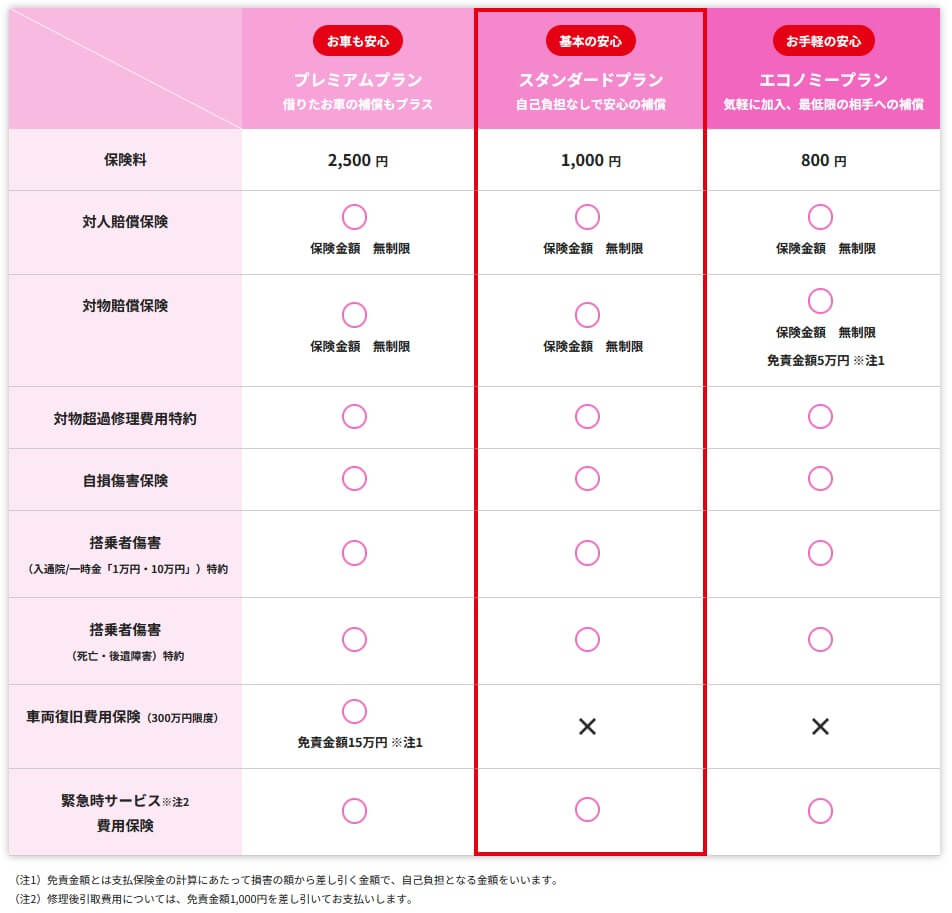 この保険のエコノミープランの保険料は他社と横並びですが、2回目以降の利用なら保険料は770円になり最安値となります。ただ、対物賠償に5万円の自己負担額5万円があります。スタンダードプランも他社より保険料が安く見えますが、他社と異なり車両補償がありません。プレミアムプランも保険料は100円ほど安いのですが、他社にある弁護士費用補償や代車費用補償がありません。