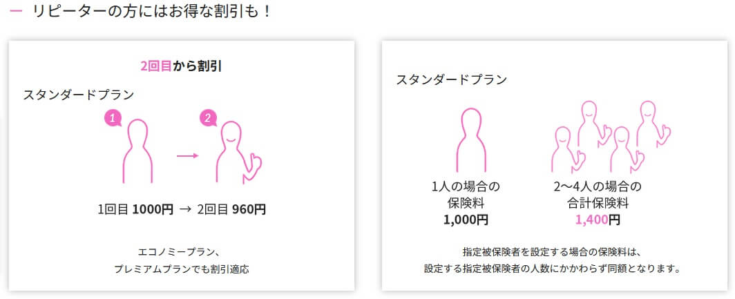 この保険の保険料は選択したプラン・初回か2回目以降かによって異なります。エコノミープランの保険料は24時間で800円ですが、2回目以降は770円になります。スタンダードプランの保険料も1000円から960円、ワイドプランの保険料も2500円から2400円に2回目以降は割引されます。
