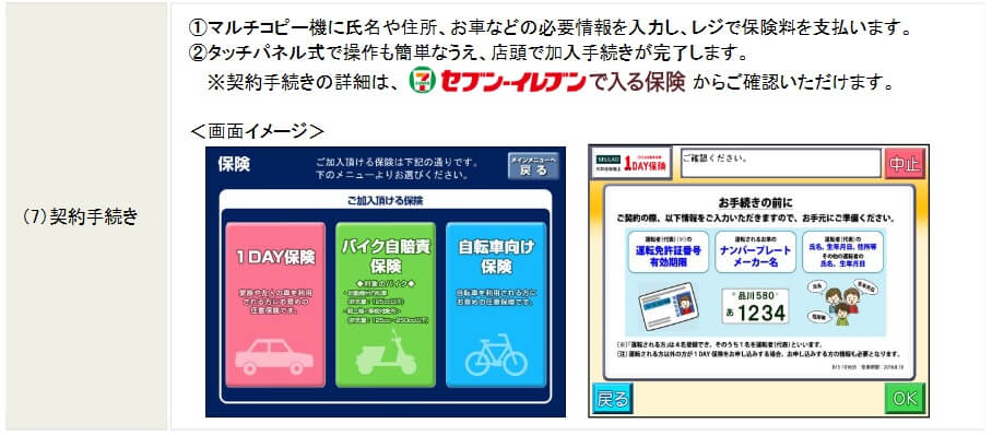セブンイレブンは三井住友海上の「1DAY(ワンデイ)保険」を、2015年9月から販売しています。セブンイレブン店内のマルチコピー機から申し込める他、事前申し込みをすればセブンで保険料を支払うだけで保険の申し込みが完了します。