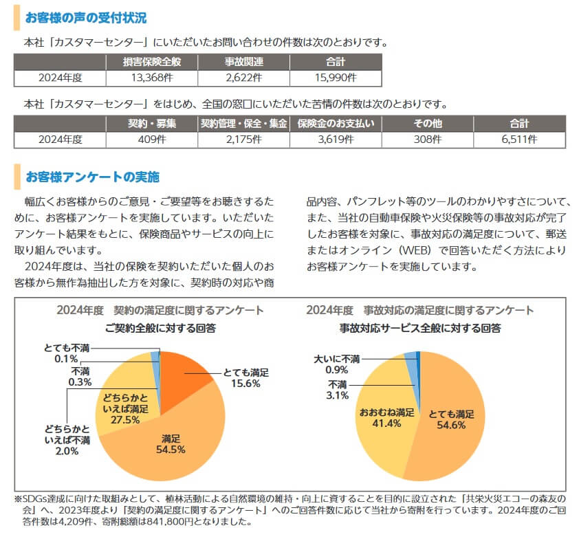 とはいえ同社が実施した「お客様アンケート」では契約全般の満足度は、とても満足・満足で合計で約70%を占めており悪くありません。事故対応の満足度だと、とても満足・満足で95%を占めています。共栄火災が自社で行った調査のため鵜呑みにはできませんが、満足度は悪くはない可能性もあります。