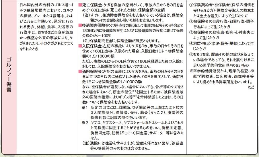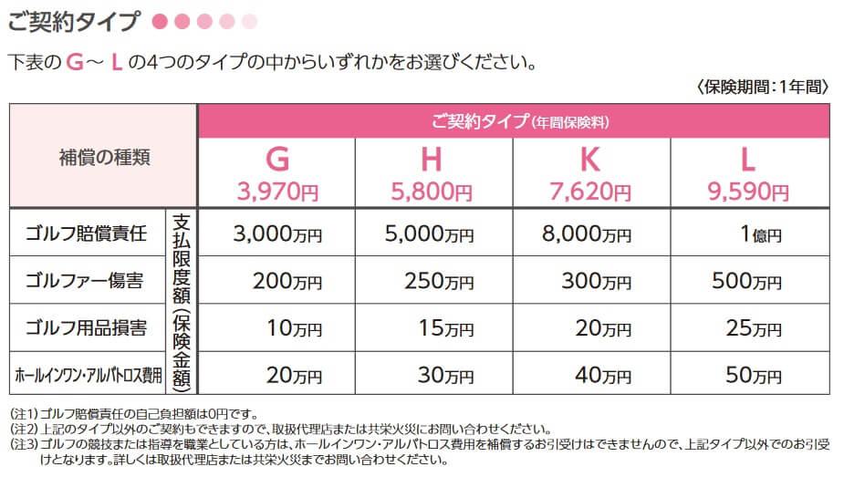 どの契約タイプも10年前から補償内容は変わっていませんが、唯一、Qタイプが無くなった点で10年前とは異なります。QタイプはLタイプの上のタイプで、ゴルフ賠償責任(2億円)・ゴルファー傷害(750万円)・ゴルフ用品損害(35万円)・ホールインワン等の補償(100万円)と補償が非常に手厚かったです。ただ、保険料が年間17160円と非常に高額だったためか、今ではパンフレット等から姿を消しています。