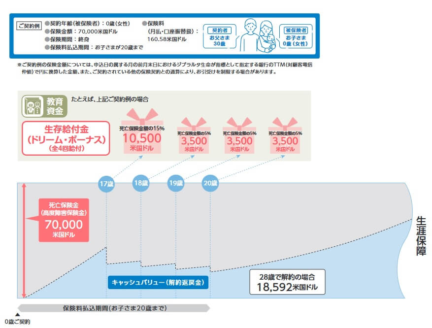 また、解約返戻金があるのもメリットです。他社の学資保険は子供が大学卒業をすると消滅しますが、この保険は解約しない限り保障は継続します。解約返戻金は保険金額7万ドルで28歳解約時に18592ドル(1ドル=150円なら234万円)のため、子供の結婚資金に100万円分、子供が生まれたら100万円分を渡すという使い方ができます。