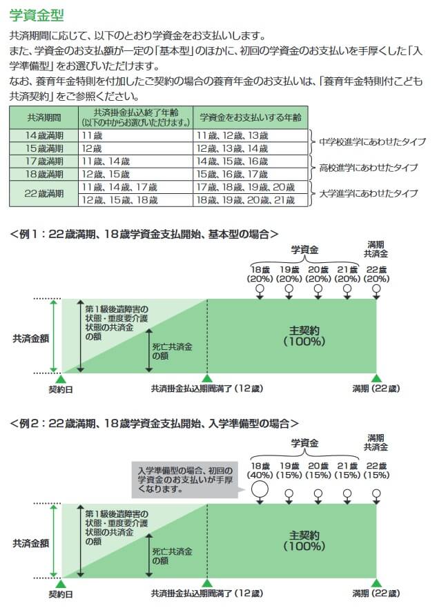 その一方で、学資金型は中学3年間か高校3年間か大学4年間に集中して学資金が受け取れます。学資金の金額は共済金額(100~1000万円)によって異なり、基本型を選択すると共済金額を均等に分けた額が3年もしくは4年間受け取れます。入学準備型を選択すると初年度の学資金のみ共済金額の40%分が受け取れ、60%分は均等に分けて残り2年もしくは3年間受け取れます。