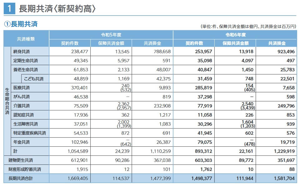 JA共済の決算資料によると、2024年度の共済全体の契約数は149.8万件で前年度の166.9万件から10%減でした。その中で、こども共済の新契約数は3.1万件で前年度の4.8万件から35%減と大幅減で、2022年度の6.7万件から数年で半減しています。他社を見渡しても減少幅は大きく、新契約数が増加している学資保険もあるため、契約数から考えるとこども共済の評判は悪そうです。