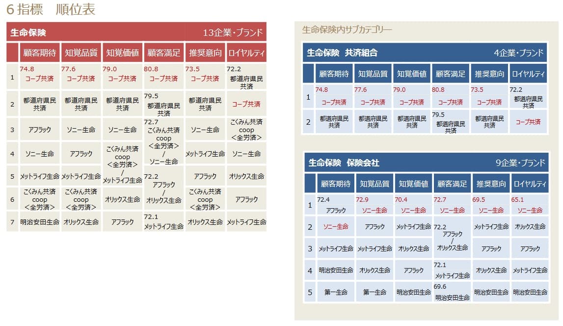 この調査では顧客期待・知覚品質・知覚価値・顧客満足・推奨意向・ロイヤリティが評価項目でランキングされています。JA共済は生命保険分野の総合ランキングで6位以下でした。都道府県民共済・コープ共済などの他の共済と比較してJA共済の満足度は低いと考えられます。