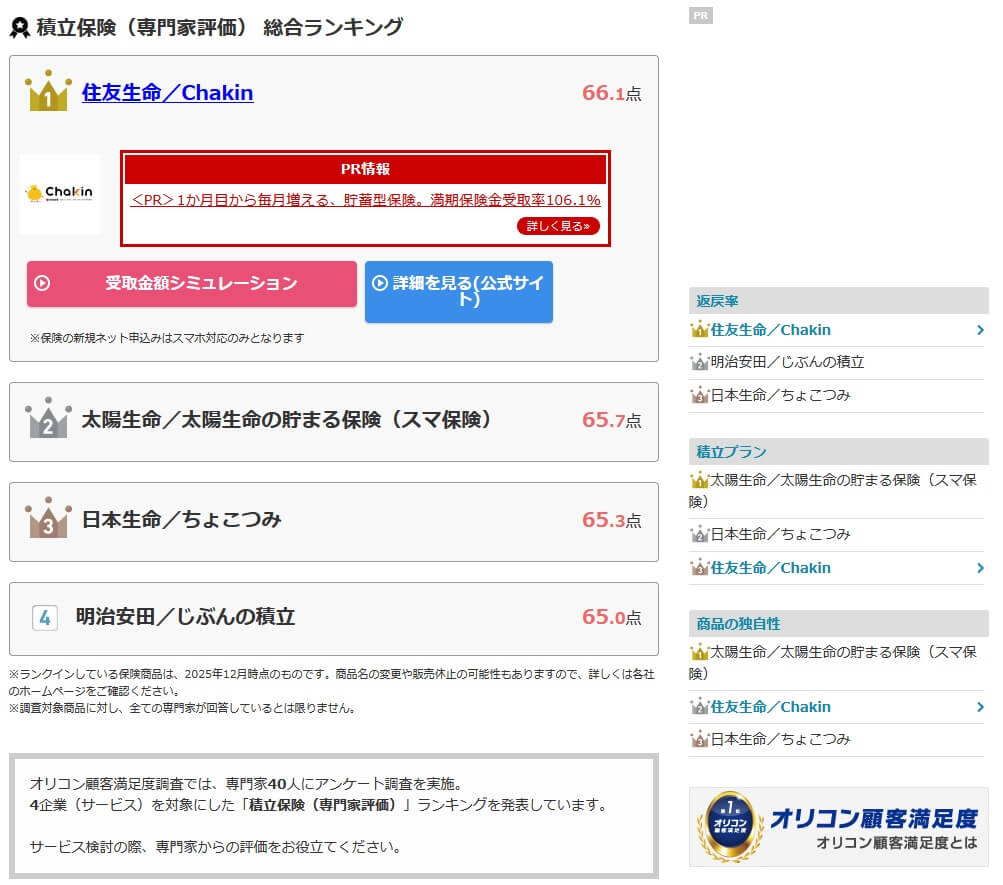 保険そのものについては、同じオリコンに「2026年 専門家が選んだ積立保険ランキング」があります。40人のFP(ファイナンシャルプランナー)が選んだランキングで、ちょこつみは4社中3位でした。積立プランで2位でしたが、返戻率・商品の独自性では3位と中途半端な順位でした。そのため専門家からの評判は普通と考えられます。