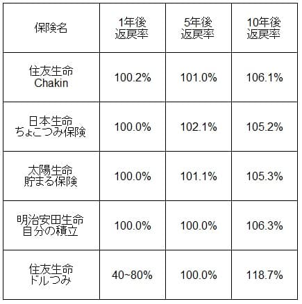 次に返戻率は他社より高いのか低いのか、下図で他社の積立保険と一覧表で比較しました。返戻率は契約してから1年後・5年後に解約した場合と、10年後の満期まで継続した場合で比較しました。