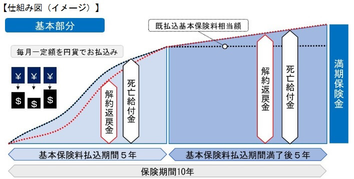 この保険の保険期間は10年で、前半の5年間のみ保険料を支払い、後半の5年間は保険料の支払いは不要です。保険料は日本円で支払いますが、日本円からドルに毎月振り替えられて積み立てられます。契約から10年後の満期を迎えると満期保険金がドルから日本円に振り替えられて受け取れます。送金手数料等を負担すれば自分の銀行の外貨口座でドルで受け取ることも可能です。
