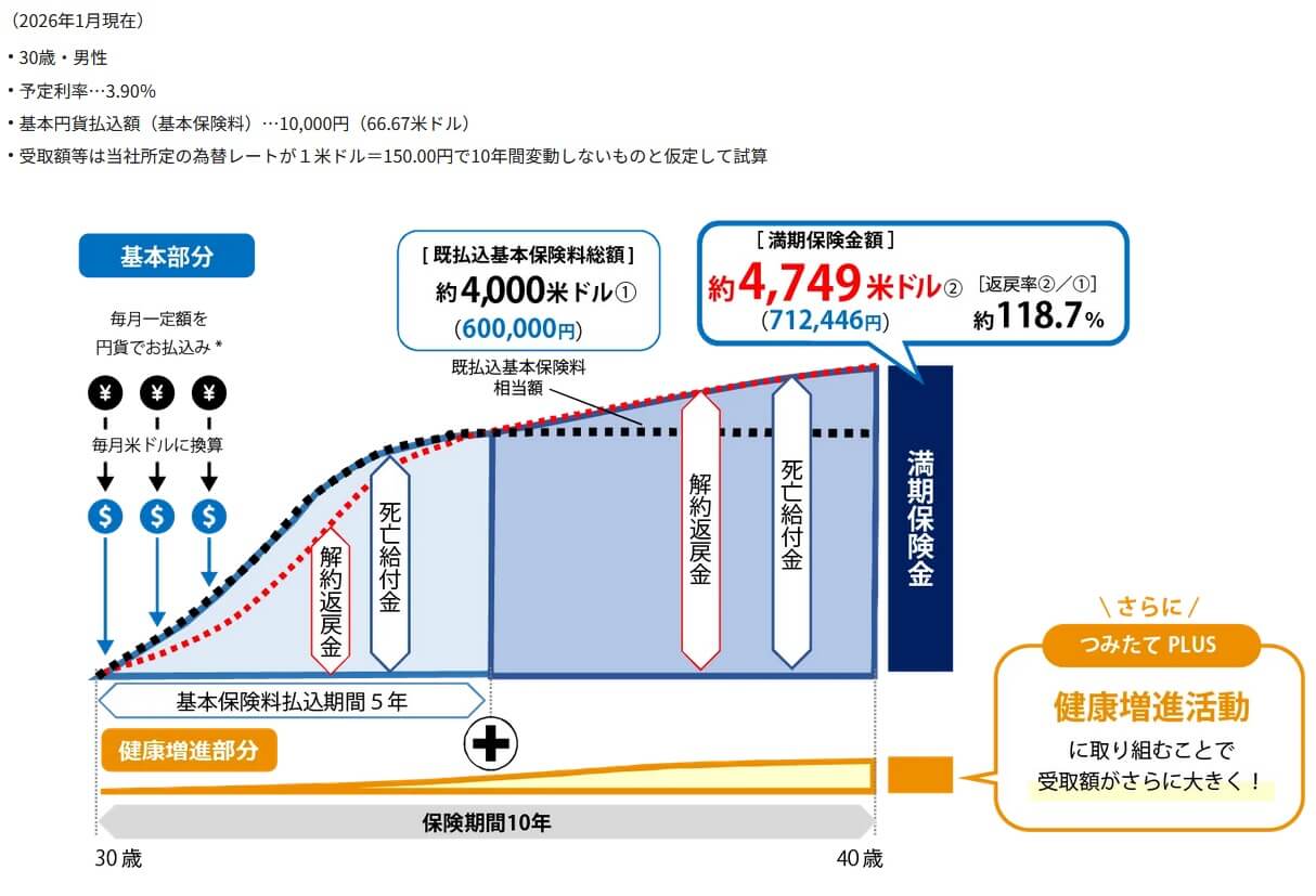 この保険の保険料は5000~15000円の範囲で1000円単位で決められます。2026年現在の予定利率3.9%で計算すると、10年後の満期時の返戻率は118.7%となります。1ドル=150円で動かないと想定して月1万円を積み立てた場合、4000ドルの積み立てに対して満期保険金は4749ドルとなり、円にすると11万円の利益が出ます。