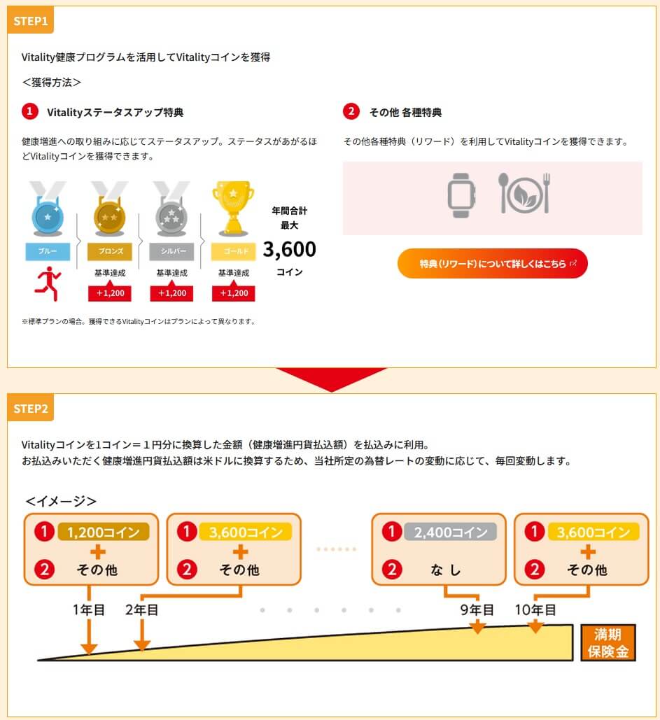 さらに「つみたてPLUS」があるのもメリットです。Vitality健康プログラムに取り組むことで、健康度のステータスアップにより年間最大3600コインが獲得できます。さらに各種特典を利用することでもコインは貯められます。例えばイオンで野菜・果物の購入で最大25%のコイン、ヨガのレッスン受講等でもコインが貯まります。コインは10年間で最高60万円まで積立に使えるため、契約当初では考えられない返戻率になる可能性を秘めています。