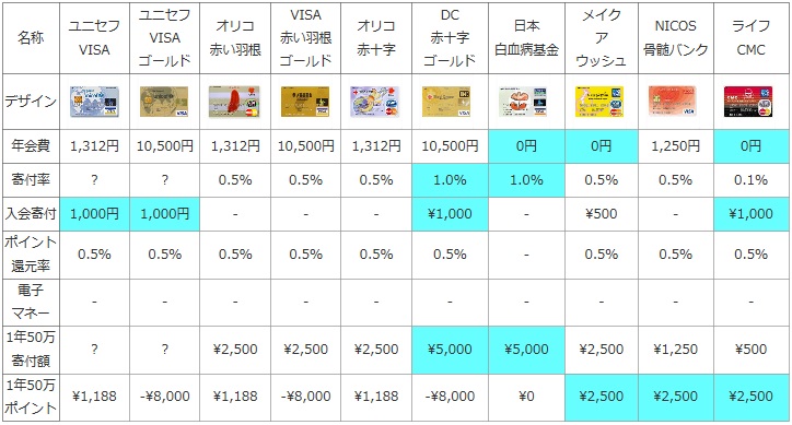次に、他の社会貢献型(寄付が可能な)クレジットカードを年会費・寄付率・入会時の寄付等を比較した。念のため記述するが、同じ団体が寄付対象の場合は別だが、寄付する団体が異なる場合、寄付率が高いカードの寄付が優れているわけではない。寄付対象の活動指針・活動実績に納得でき、寄付に相応の価値を感じるならば、下図の如何なる団体への寄付も須らく等しい価値を持つはずだ。あくまで数値は参考程度に考えてもらいたい。また、"1年50万寄付"は1年間で50万円をカード利用した場合の寄付金額を記載し、"1年50万ポイント"は1年間で50万利用して得られたポイントから年会費を差し引いた金額を記載した。