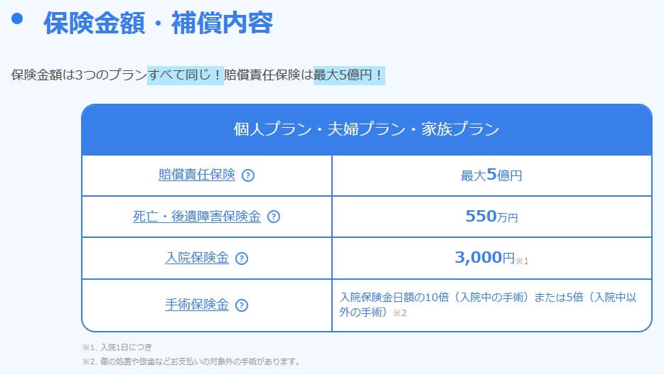 また、補償面では個人賠償責任補償の上限金額が5億円と他社より高いのもメリットです。今のところ自転車事故の加害事故の賠償額は1億円程度ですが、今後も1億円程度で済むかは分かりません。ある程度の賠償額の上昇を見込んでも、さすがに5億円あれば事足りるでしょう。他社のギリギリ1億円よりも安心感があります。