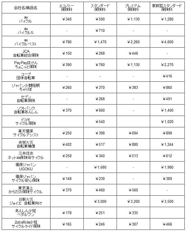 次に保険料は他社より安いのか高いのか、下図で他社の自転車保険と一覧表で比較しました。各社の最も安いコースをエコノミーコース、中間のコースをスタンダードコース、最も高いコースをプレミアムコースとして統一して保険料を記載しました。また、保険料が一時払いの保険は月額換算し、参考までに家族型のスタンダードコースの保険料も比較しました。