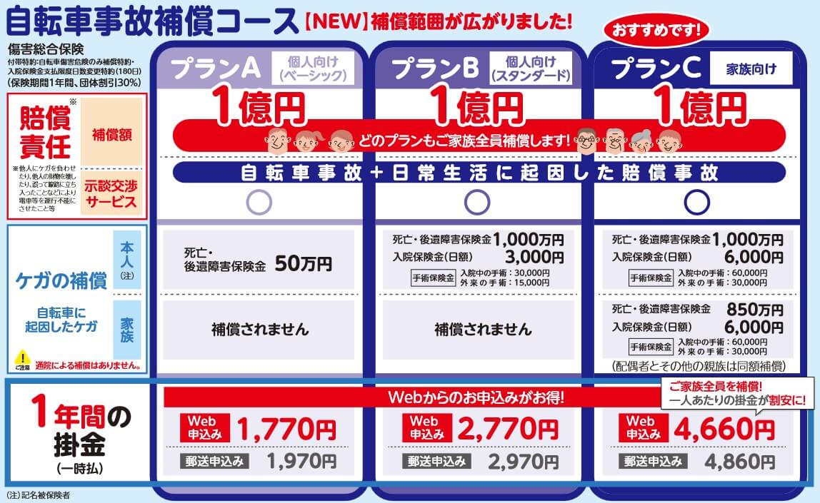 自転車事故補償コースは、プランA(個人向けベーシックプラン)だと自転車事故で死亡・後遺傷害になると50万円が受け取れます。プランB(個人向けスタンダードプラン)だと死亡・後遺傷害で1000万円が受け取れ、さらに入院1日おきに3000円の入院保険金、手術で手術保険金が1.5~3万円が受け取れます。プランC(家族向けプラン)だと家族まで補償が及びます。どのプランも事故で加害者となった場合の賠償額が1億円まで補償されます。
