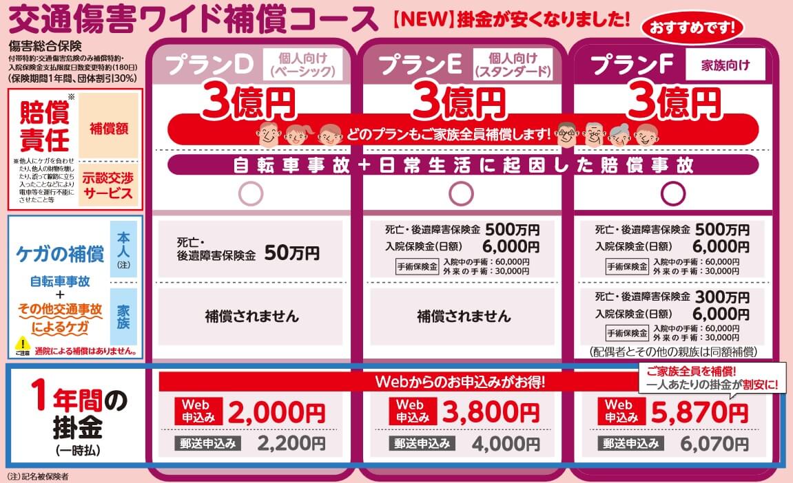 さらに各コースには補償内容が個人賠償責任補償と死亡補償のみ、というシンプルなプランがあります。どちらのコースにせよ選択したプランによって保険料を安くできます。交通傷害ワイドコースの保険料が最安値のプランでも保険料は年間2000円(月額166円)のため、保険料は他社と比較して最安値圏にあります。
