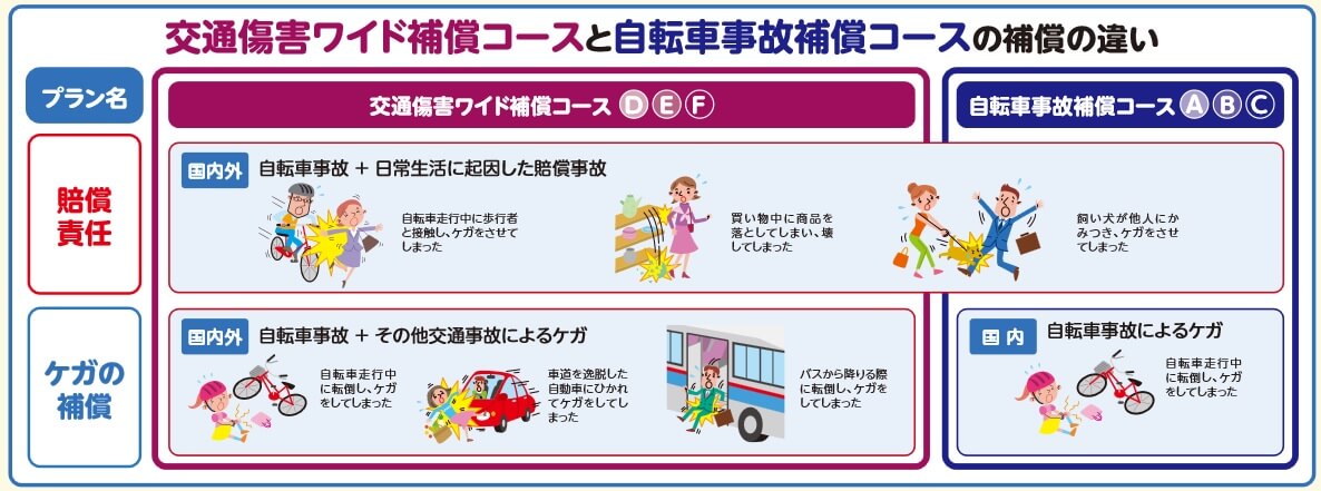 この保険には自転車事故補償コースと交通傷害ワイドコースがあります。自転車事故補償コースだとケガの補償が自転車事故に限られますが、交通傷害ワイドコースならケガの補償が自転車事故に限らず交通事故全般に広がります。各コースには個人向けベーシックプラン、個人向けスタンダードプラン、家族向けプランがあります。