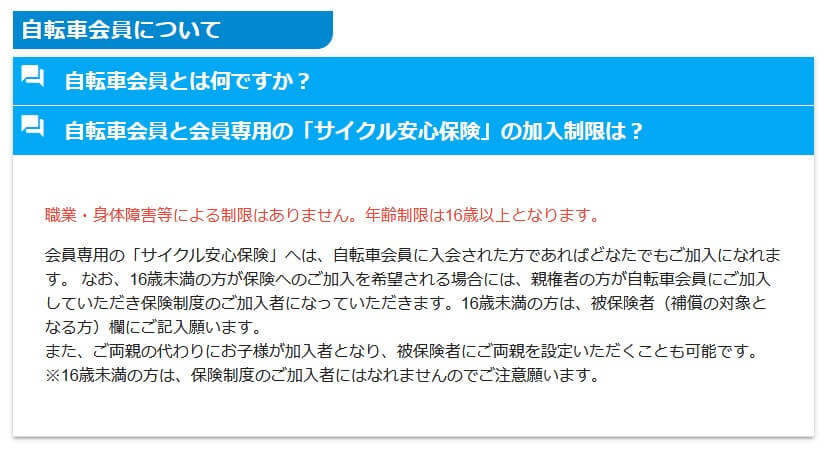また、メリットで加入するのに上限年齢が無い点を挙げましたが、その逆に下限年齢が16歳である点に注意が必要です。16歳未満は自転車会員になれないため、子供が加入する場合には親権者が自転車会員になる必要があります。親が家族プランに加入して子供を被保険者にする形式となり、子供だけを補償の対象にはできず保険料も家族プランにする分だけ高くなります。