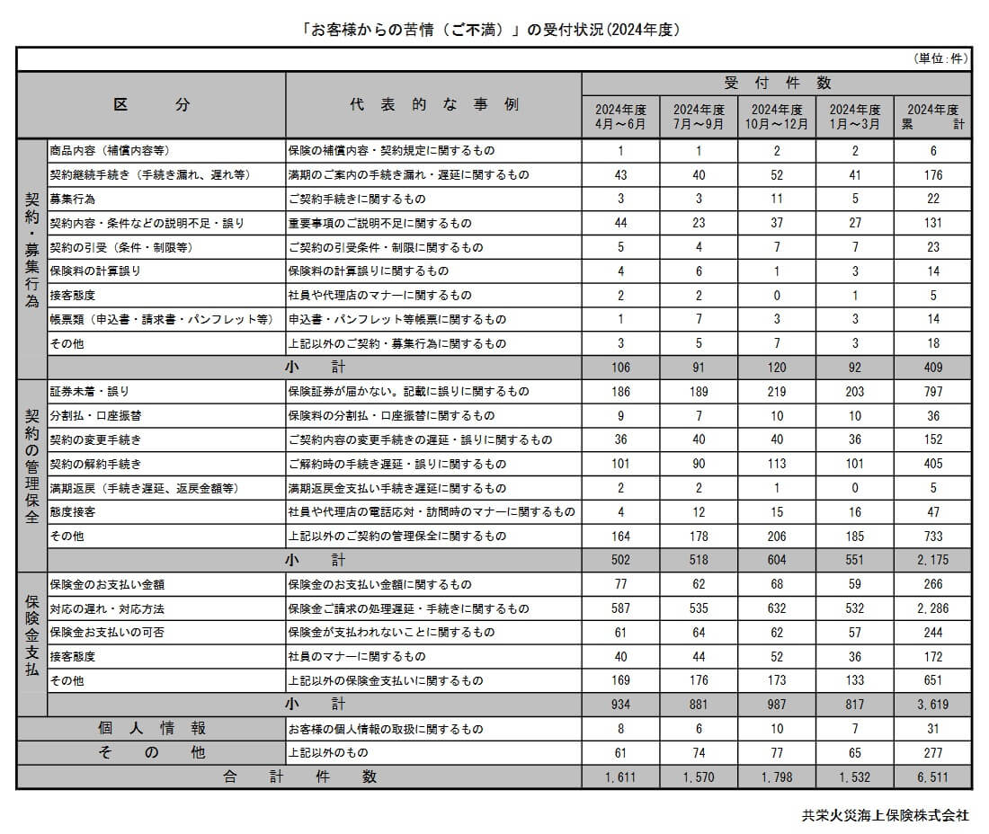 また、日本損害保険協会の苦情数のデータでは、共栄火災全体に寄せられた苦情数は6511件(2024年度累計)でした。苦情の中身は「保険金の支払」が多めで、保険金請求後の対応の遅れや手続きの煩雑さが懸念されます。次いで多いのは「契約の管理・保全」の苦情で、住所変更や解約等の手続き等の遅れ・誤りが懸念されます。