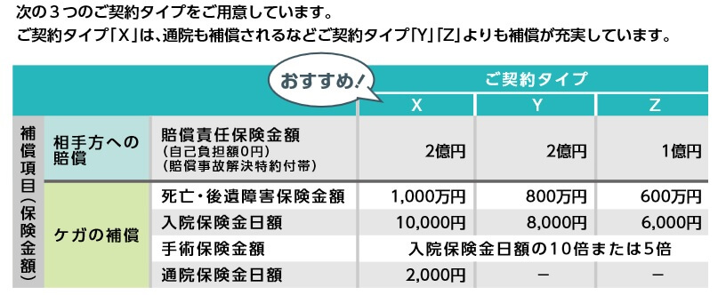 Yタイプにすると各保険金の額が増額されます。死亡保険金・後遺障害保険金が800万円、入院保険金は日額8000円に増加されます。手術保険金の額は入院保険金に連動するため、入院中の手術は8万円、外来での手術は4万円に増額されます。個人賠償責任保険金が2億円に増額されます。