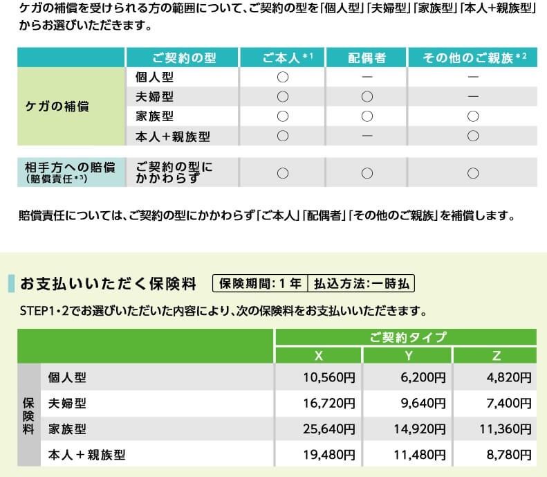 この保険の保険料は選択したプランと補償される人の範囲によって異なります。Zタイプの保険料が最も安く、Yタイプが中間、Xタイプの保険料が最も高いです。補償される人の範囲が広くなるほど保険料は高くなります。個人型・夫婦型・本人+親族型・家族型の順に保険料が高くなります。