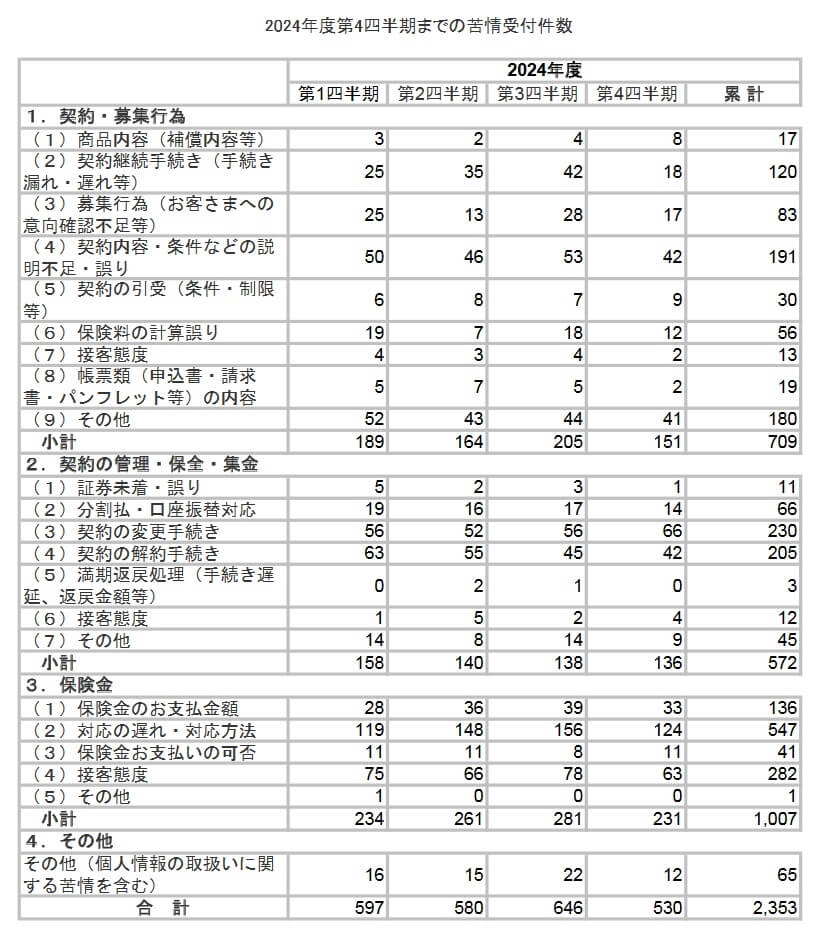 また、日本損害保険協会の苦情数のデータでは、日新火災全体に寄せられた苦情数は2353件(2024年度累計)と少なめでした。苦情の中身は「保険金の支払」が多めで、保険金請求後の対応の遅れや対応方法が懸念されます。次いで契約の変更・解約の手続き、契約時の契約内容の説明不足・誤りについての苦情が多めでした。