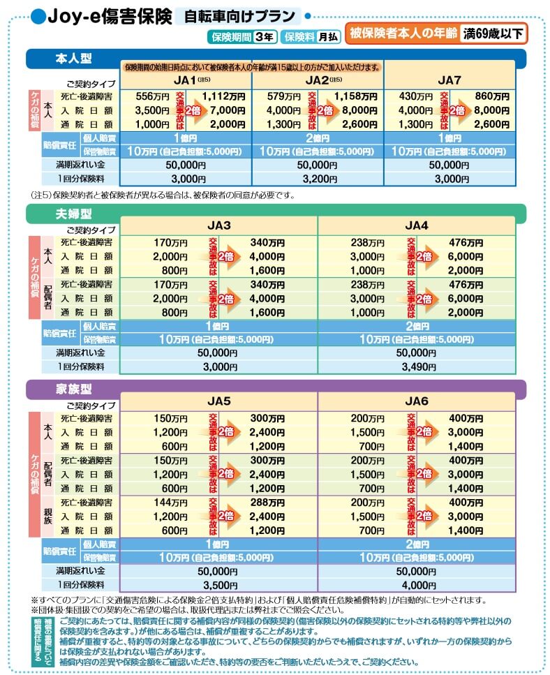 夫婦型も基本的な補償内容は同じで、ケガで死亡・後遺障害・入院・通院すると保険金が受け取れます。交通事故なら各保険金は倍額になり、本人も配偶者(夫・妻)も保険金は同額です。家族型も基本的な補償内容は同じですが、JA6プランなら本人も家族も親族も受け取れる保険金額は同額です。ただ、JA5プランにすると親族のみ各保険金額が減額されています。