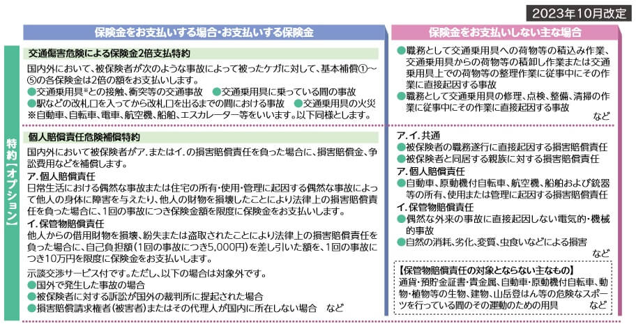 補償面では個人賠償責任補償に保管物賠償責任補償があるのもメリットかもしれません。保管物賠償責任補償は他人から借りた物を壊した場合に10万円まで補償されます。例えば他人から自転車を借りて事故にあって壊した場合、壊した自転車が10万円まで補償されます。他社では保管物は補償外とするケースも無くはないため、メリットといえるでしょう。