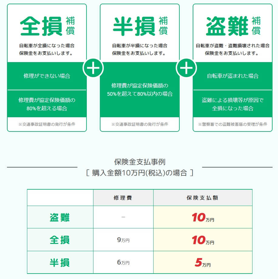 半損補償は自転車の修理費が協定保険価額の50~80%になった場合の補償で、協定保険価額が10万円なら5万円が受け取れます。盗難補償は自転車を盗難された場合の補償で、協定保険価額が10万円なら全損と同様に10万円が受け取れます。自転車の行方が完全に消えた場合に加えて、見つかったものの全損に近い状態(一部のパーツのみ見つかった等)でも盗難として補償されます。