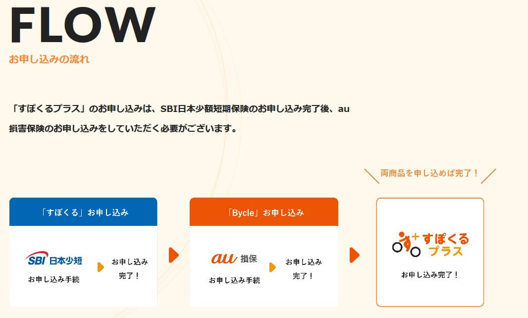 すぽくるプラスは補償対象となる自転車は絞らず、盗難・破損以外に自転車搭乗者のケガの補償と個人賠償責任の補償等が追加されます。ケガの補償等はSBI日本少短ではなくau損保が担い、補償内容はバイクルと同様の内容です。au損保にはバイクル以外にバイクルベスト・バイクルSがありますが、基本的にバイクルとなり選択の余地はありません。