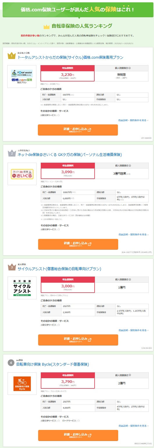 さらに契約数でいうと保険市場の「2025年9月版 自転車保険人気ランキング(申込数)」では、リニューアル前のeサイクル保険が1位でした。価格.comの「2025年10月更新 自転車保険の人気ランキング(契約数)」では、トータルアシストからだの保険(サイクル)の価格.com専用プランが1位になっており、非常に人気が高いのが分かります。